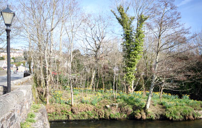 Daffodils on the island under the Medieval bridge over the Fowey at Lostwithiel